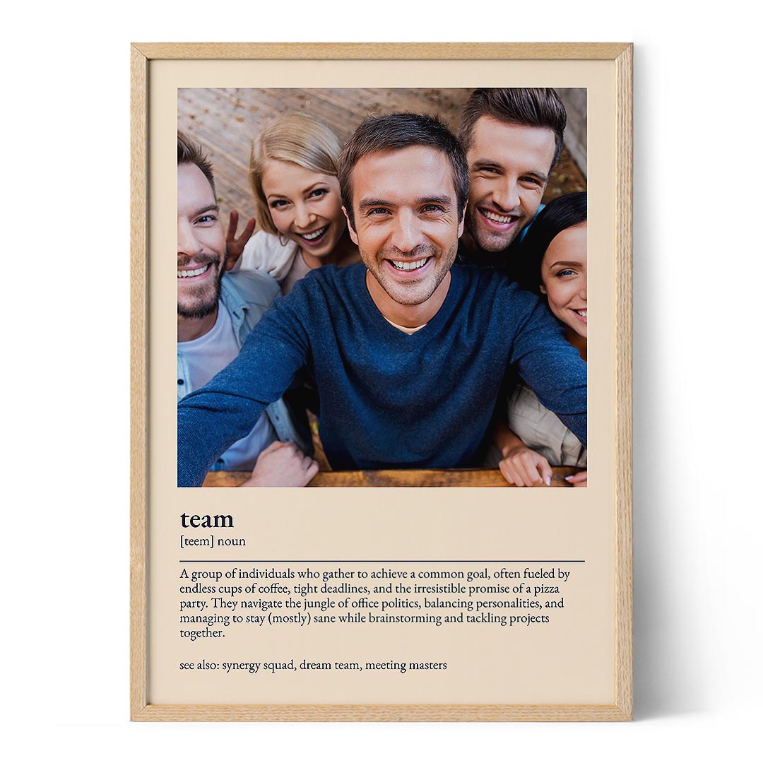 Looking for a unique and fun gift for your coworkers? Our Team Definition Poster is the perfect choice. This personalized print features your own photo and a dictionary definition of the word "team," making it a memorable and thoughtful gift.