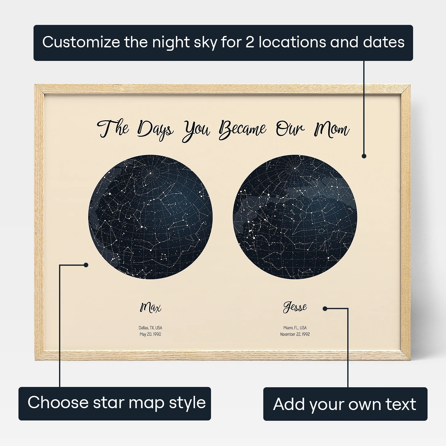The Days You Became Our Mom is a personalized multi-star map that captures the exact night sky on the day each child was born. It refers to a custom-designed print that visually represents the celestial alignment at those life-changing moments.
