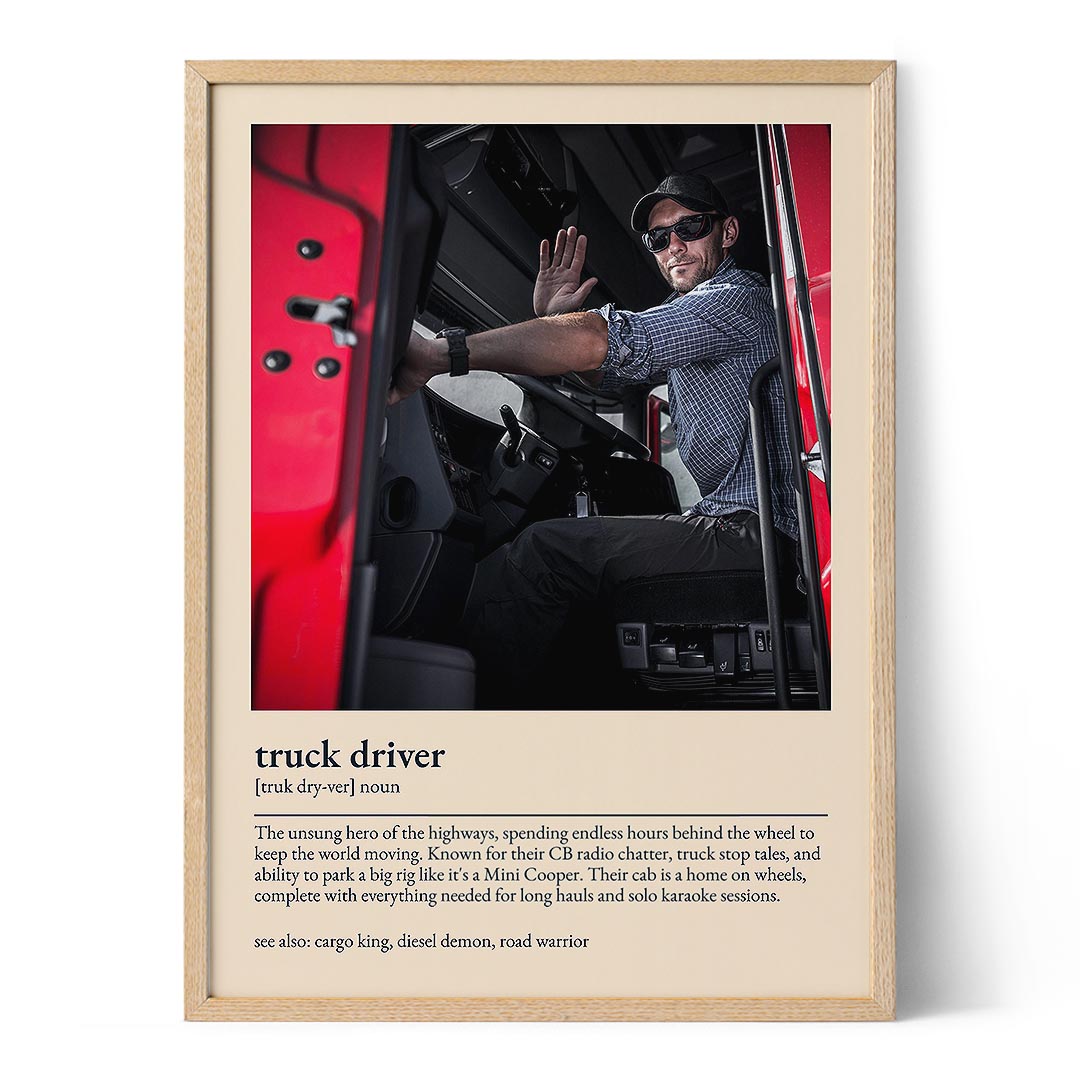 Looking for a unique and fun gift for the truck driver in your life? Our Truck Driver Definition Poster is the perfect choice. This personalized print features your own photo and a dictionary definition of the word "truck driver," making it a memorable and thoughtful gift.