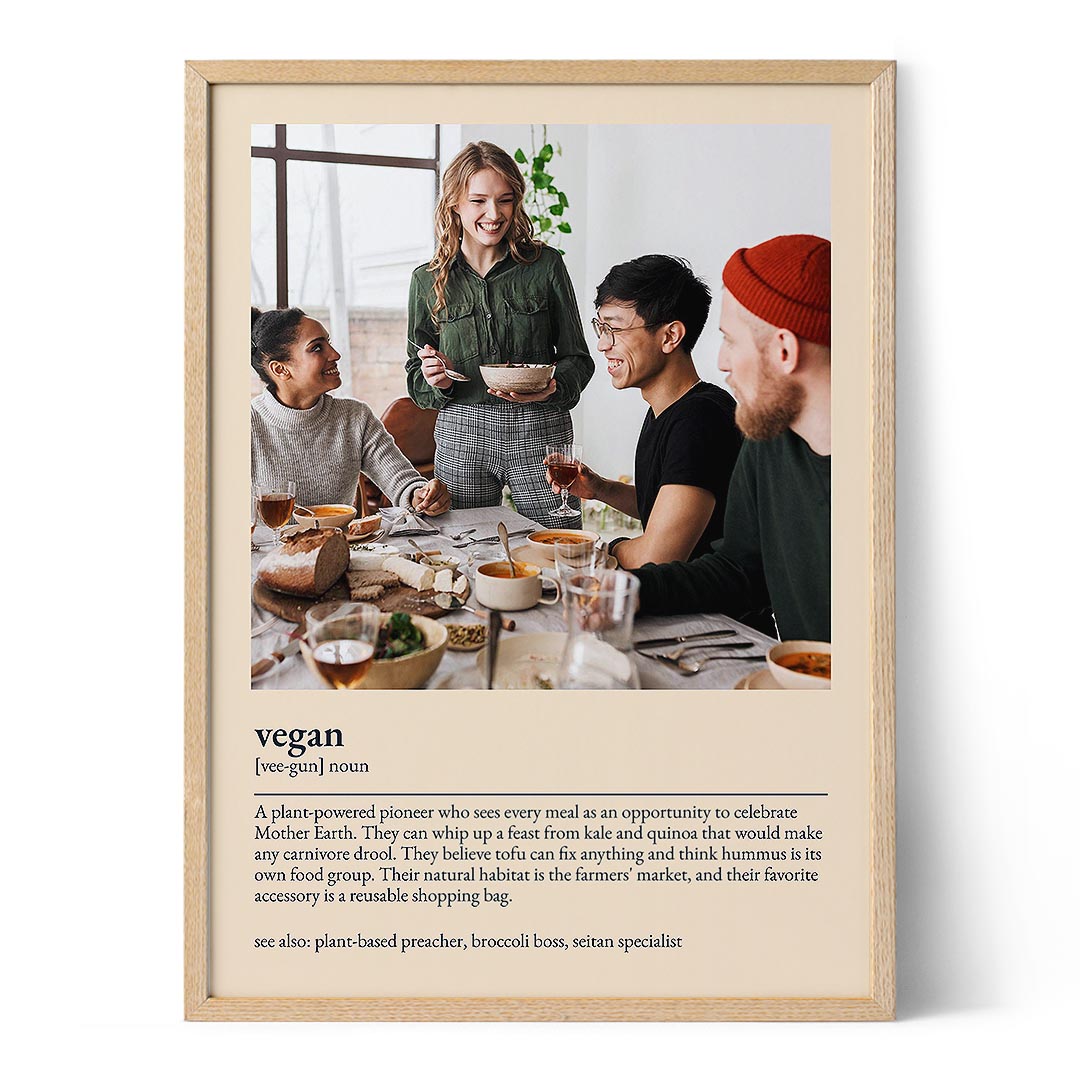 Looking for a unique and fun gift for the vegan in your life? Our Vegan Definition Poster is the perfect choice. This personalized print features your own photo and a dictionary definition of the word "vegan," making it a memorable and thoughtful gift.