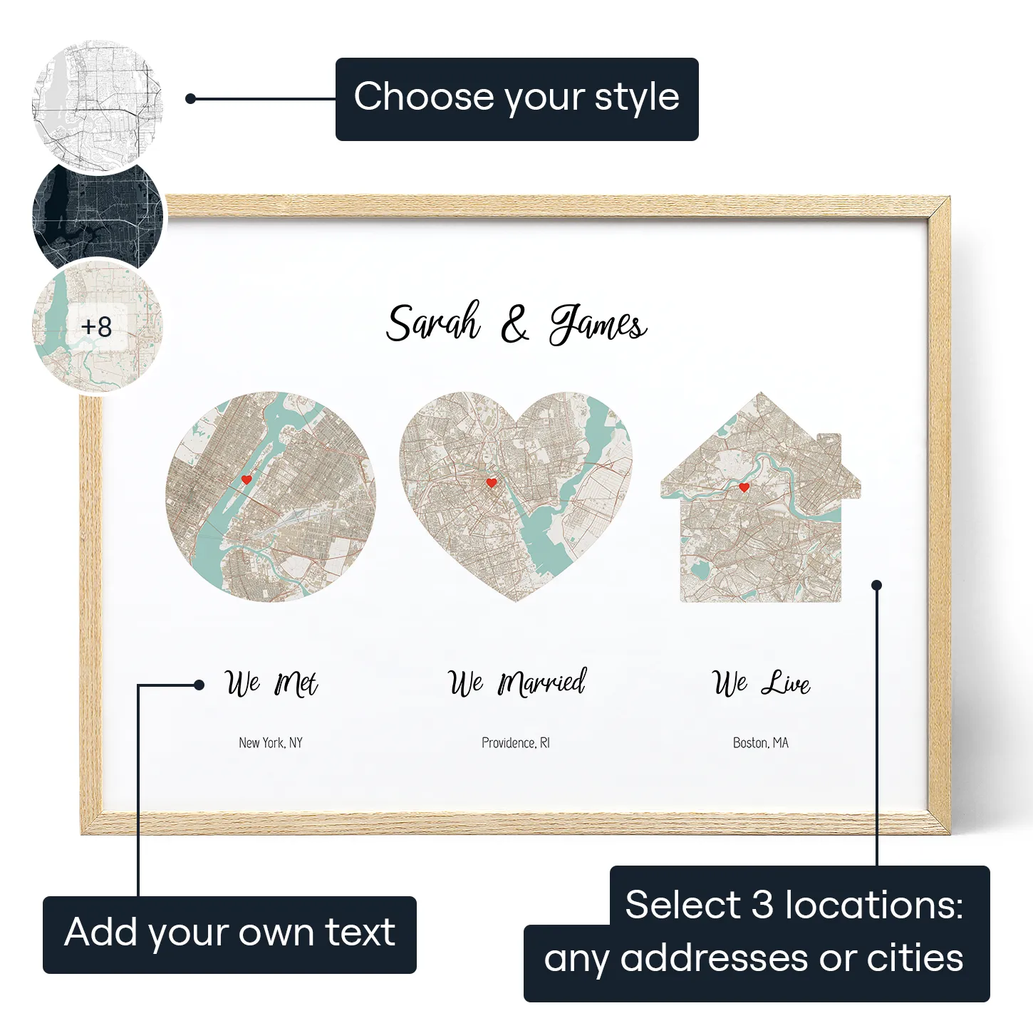 Celebrate 3 relationship milestones with a personalized map, a unique and sentimental keepsake to cherish