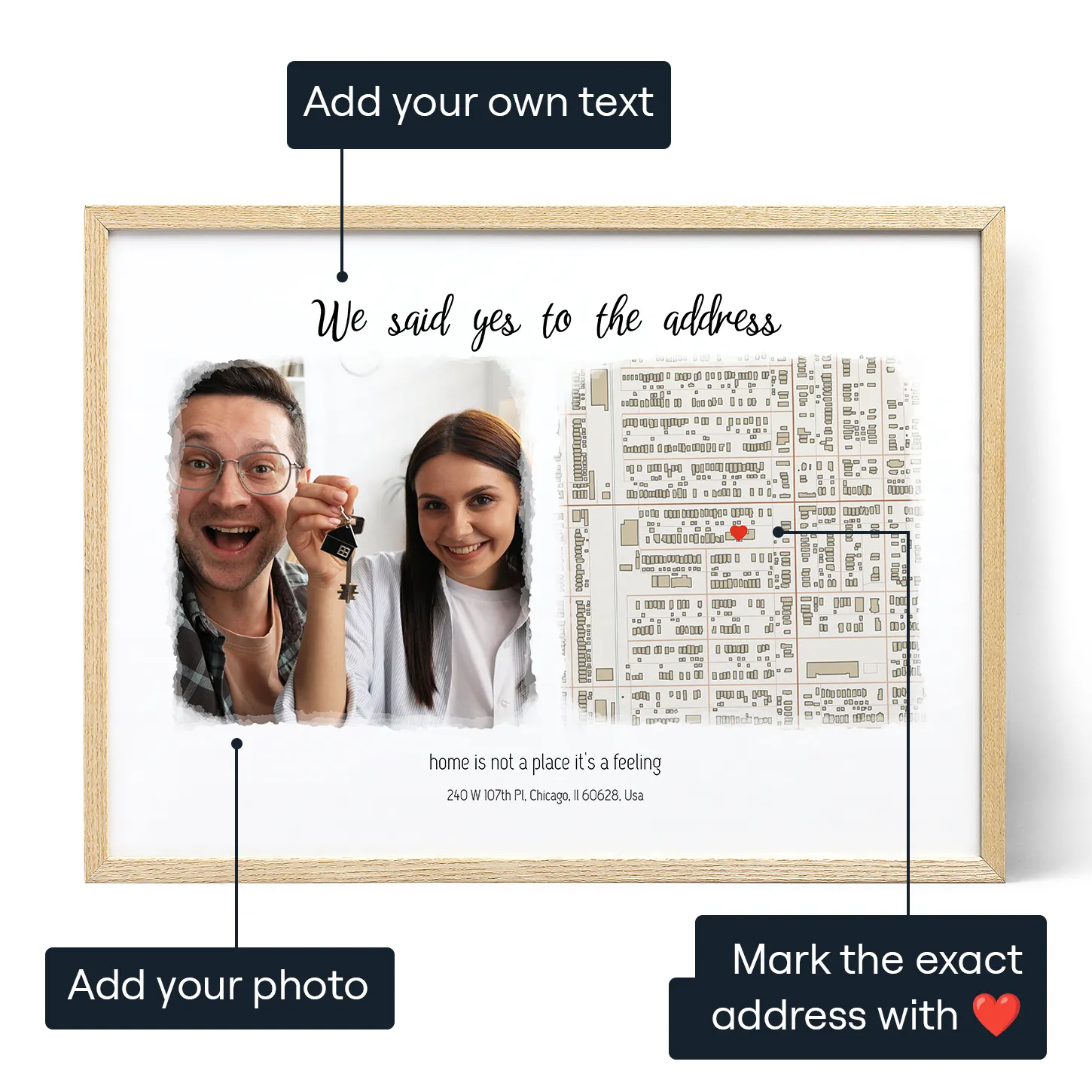 Recreate the moment with a custom map and your photos as we mark the exact location of price less memories. For the milestone purchase, those seeking a distinctive present for new homeowners or real estate professionals looking for a meaningful housewarming gift will find "We Said Yes to the Address" to be the perfect choice.