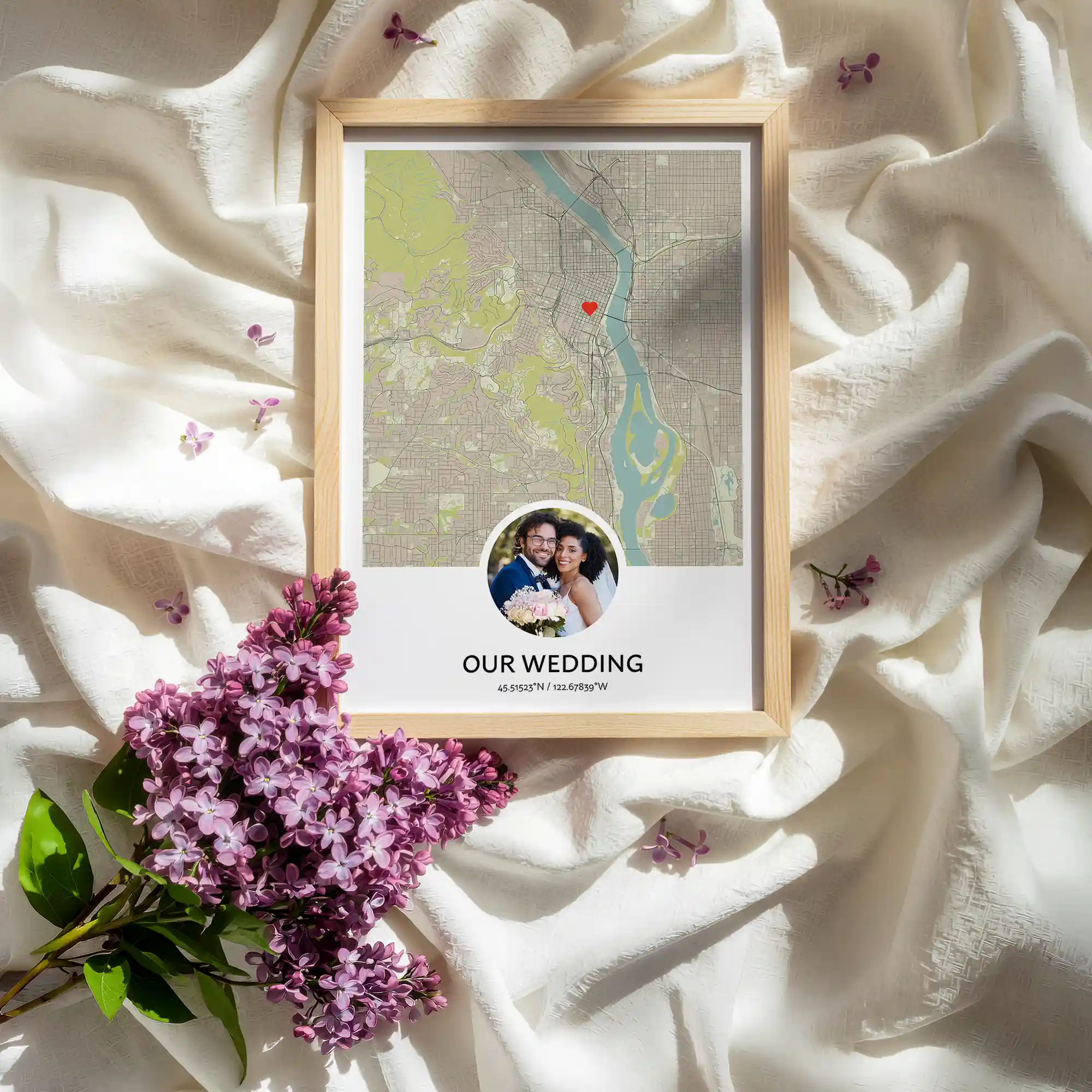 Commemorate the place where the wedding took place with our Wedding Map with Photo. This personalized print features a detailed map highlighting the exact location, a heart-shaped marker to pinpoint the spot, a photo of the couple, and a custom message below the map and photo.