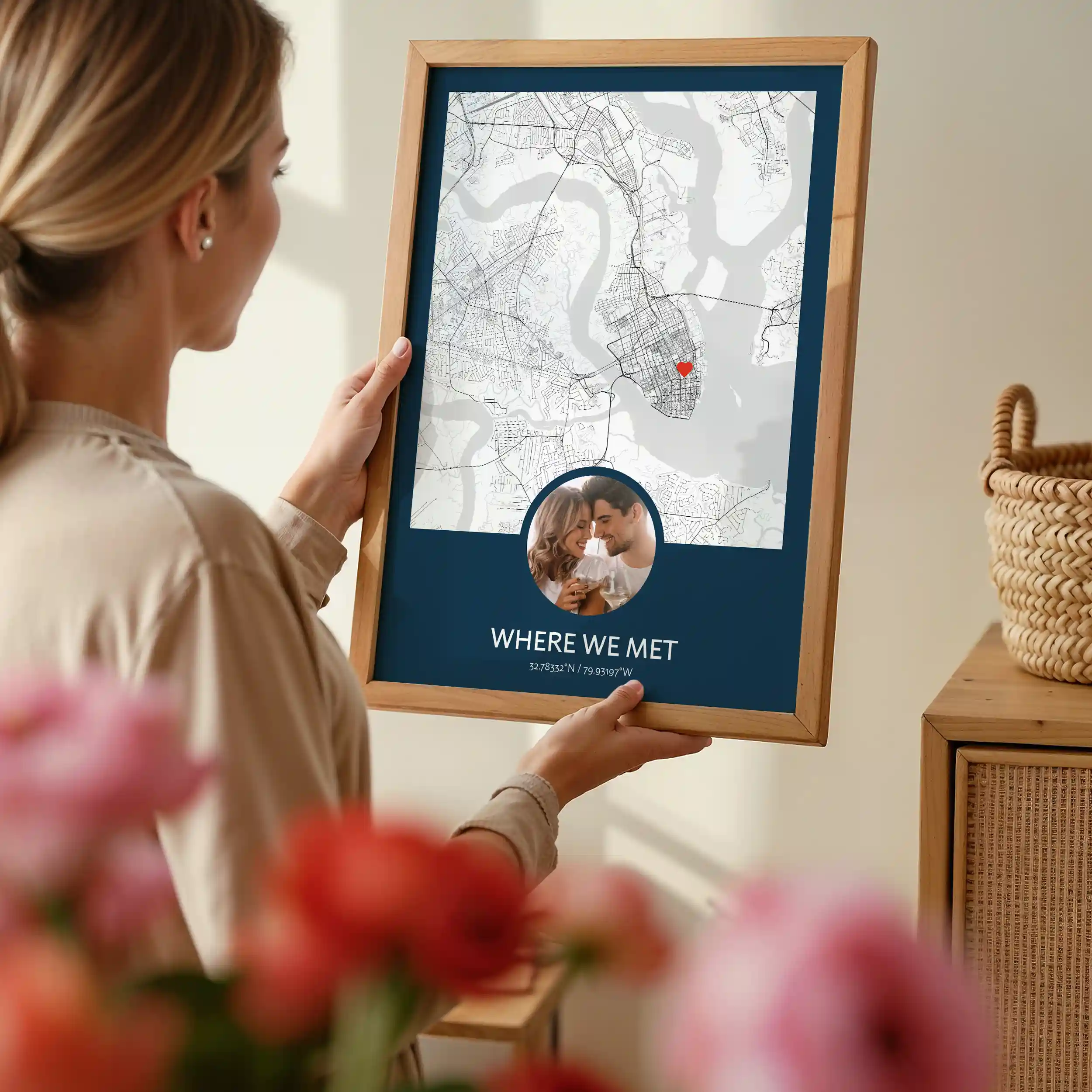 Capture the moment you and your love met with a personalized map of the exact location