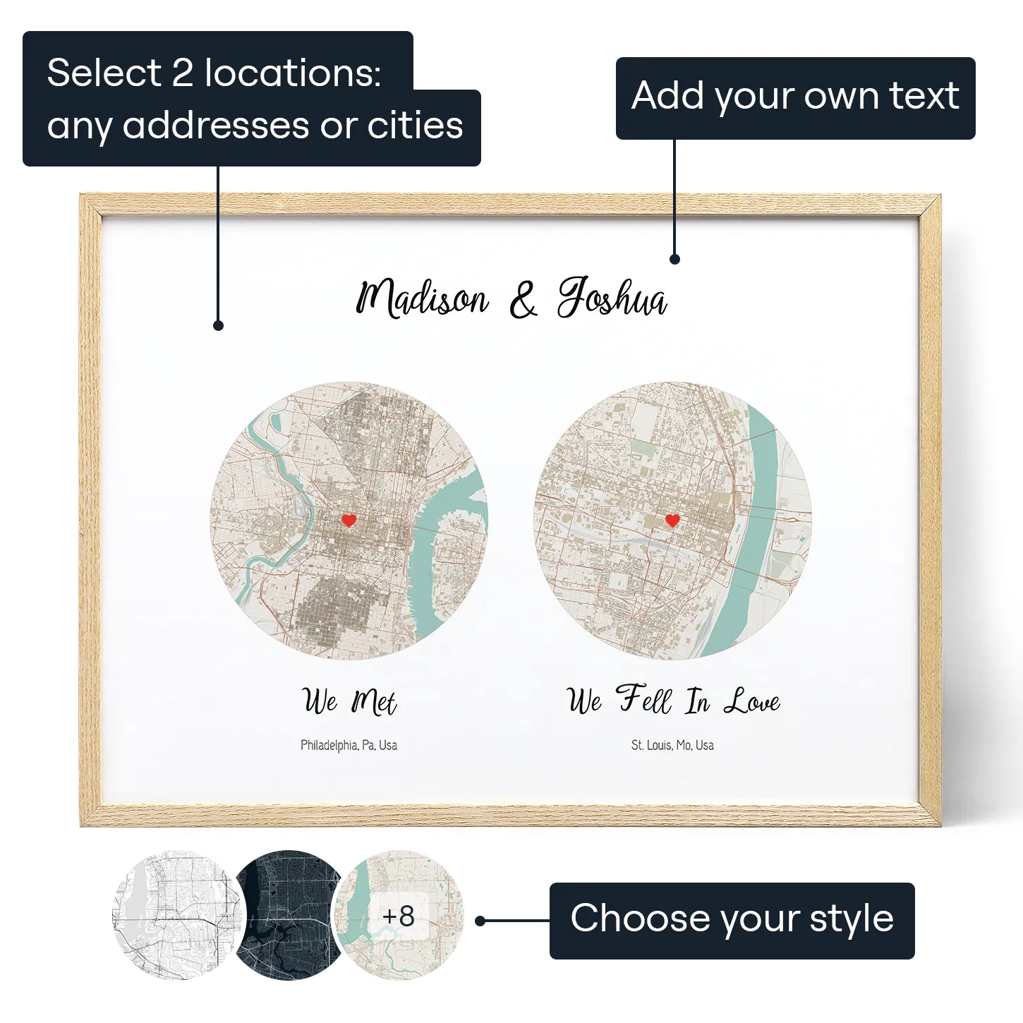 Finally, choose how you want your map printed - whether with or without a frame, as canvas, or as an instant digital file that you can take to your local print company. By following these simple steps, you can create a beautiful and personalized Where We Met Double Map that captures the essence of your love story.