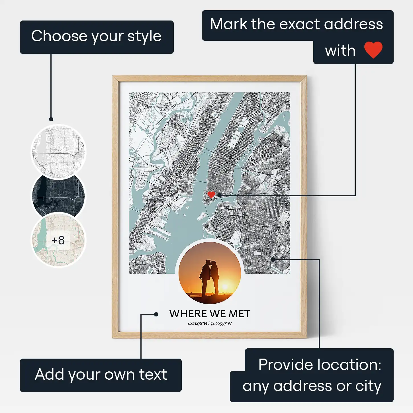 Our online creator makes personalization simple. Choose the shape and colors of the map, selecting from predefined color schemes or playing with colors yourself. Enter the location, zoom in and out to get the perfect view, and add a heart-shaped marker to pinpoint the exact spot. Upload your favorite photo and add a meaningful message like "Where We Met."