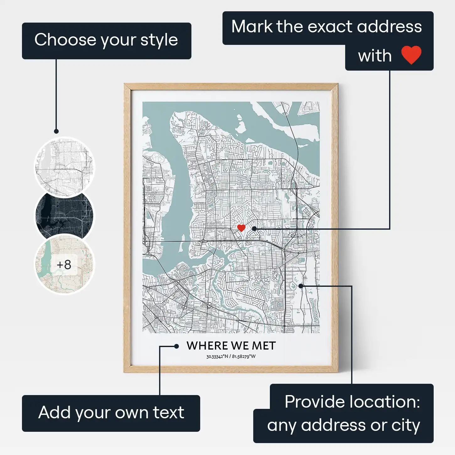 Capture the moment you and your love met with a personalized map of the exact location