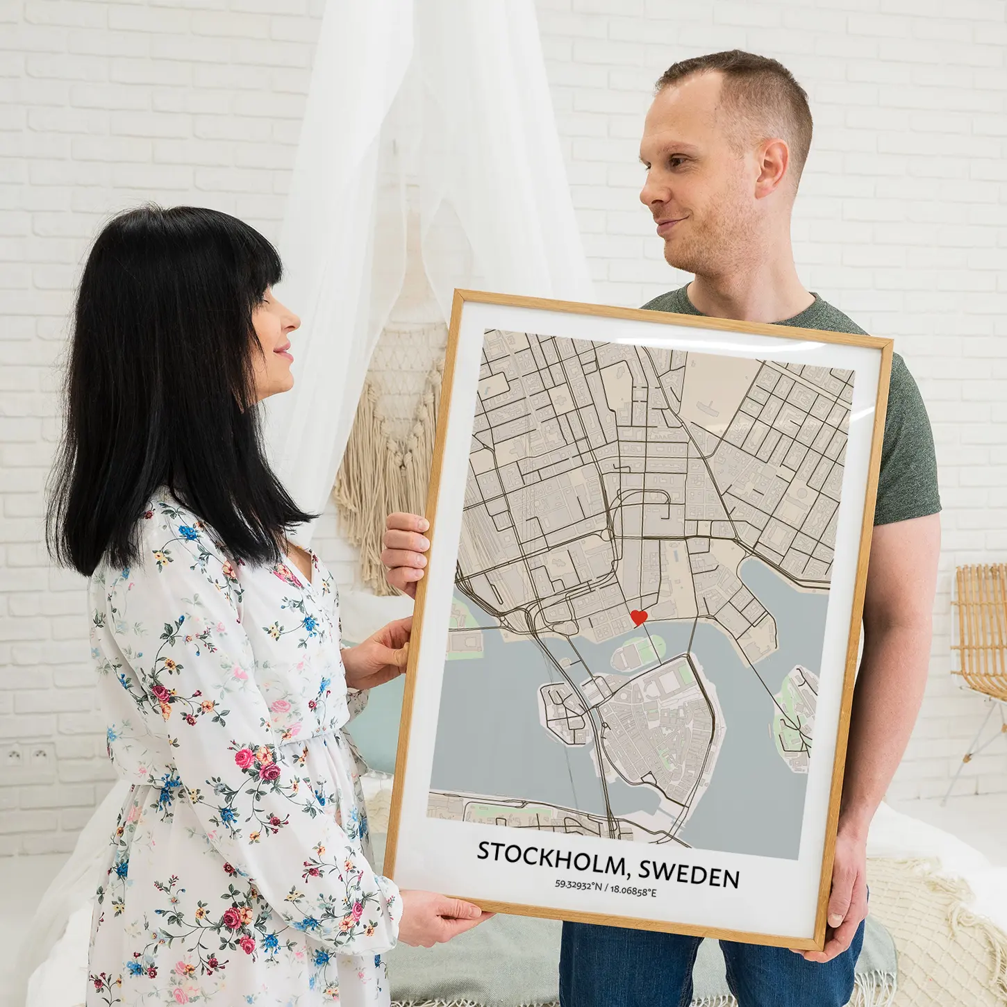 Ingenting drar ögonen till sig som ett konstuttryck i affischstorlek av en anpassad karta som hänger på väggen. Nu kan du skapa ett utskrift av en stadskarta över din favoritplats var som helst i världen. Vår skapare av skräddarsydda kartor ger dig alla verktyg för att anpassa din karta efter form (du kan välja även hjärtformade kartor), design, plats och kartmarkeringar. Få din anpassade stadskarta levererad som en affisch, canvas eller som en omedelbar digital nedladdning.