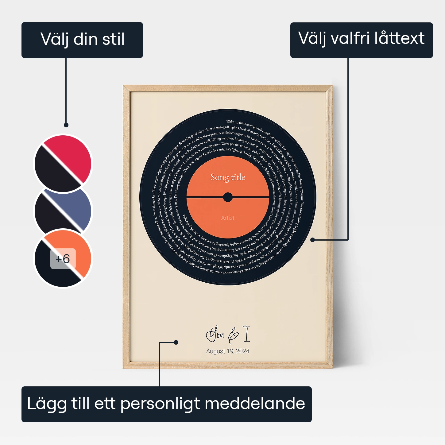 Besök vår online editor och börja med att välja en bakgrund. Du kan välja bland våra fördefinierade alternativ eller skapa din egen. Välj sedan den sångtext som du vill visa. Du kan också lägga till ett personligt meddelande under texten för att göra den extra speciell.