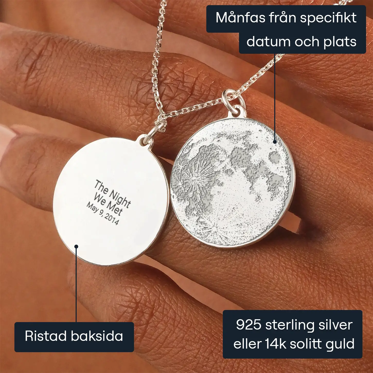 Letar du efter den perfekta presenten till någon du tycker om? Våra skräddarsydda månfassmycken är svaret. Föreställ dig deras ansiktsuttryck när de får ett hänge med månfasen från den dag ni träffades första gången eller den dag de föddes. Det är en omtänksam gest som garanterat kommer att beröra deras hjärta.