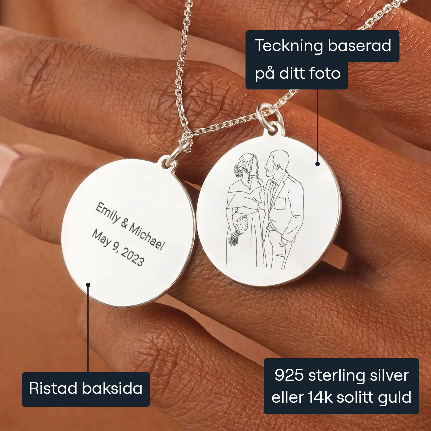 Med våra Anniversary Line Art Jewelry är varje hänge ett unikt exemplar. Våra begåvade konstnärer handritar varje design från ditt foto och skapar vacker minimalistisk linjekonst. På baksidan kan du lägga till ett eget meddelande som ditt bröllopsdatum eller en personlig anteckning som "Forever Yours".