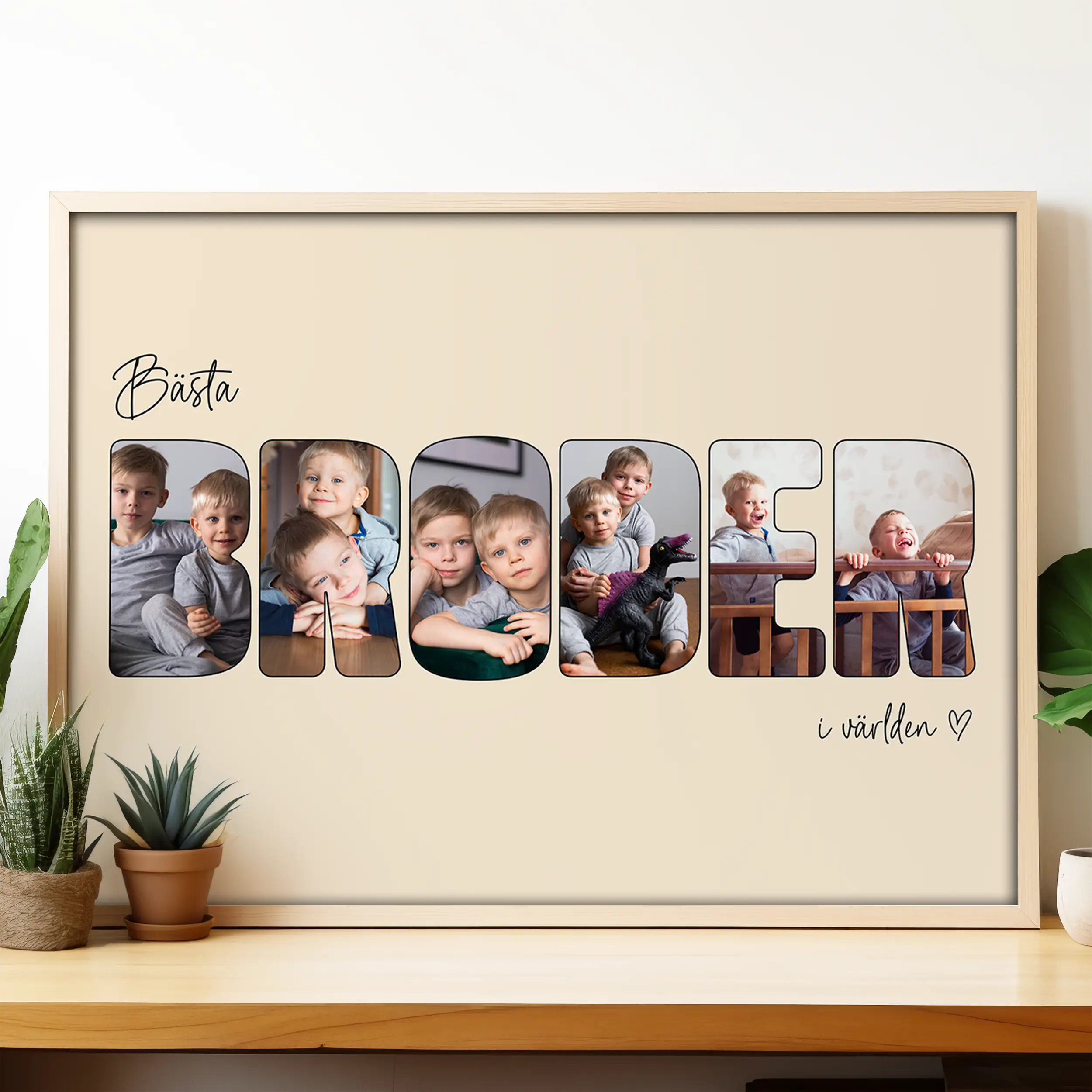 Bröder delar ett band som inte liknar något annat, och de förtjänar en unik och personlig gåva för att fira detta band. Så varför inte skapa en riktigt speciell present med Brother Letter fotocollage? Din bror kommer att bli glad över att ha ett konstverk som föreställer era bästa stunder och han kommer alltid att hålla det nära sitt hjärta.