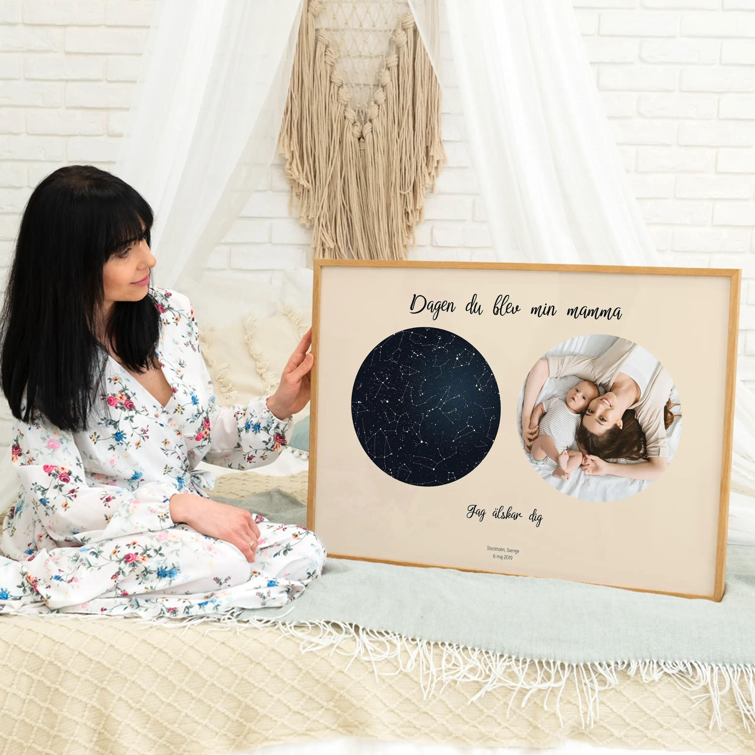 Ge bort kärlek och minnen med "Dagen då du blev min mamma med foto". Detta innerliga konstverk fångar stjärnhimlen från dagen då din mamma blev mamma. Oavsett om det är hennes födelsedag, mors dag eller jul är det det perfekta sättet att visa din kärlek. Inkludera ett foto av dig och din mamma bredvid stjärnkartan och se hur glädjetårarna rinner.