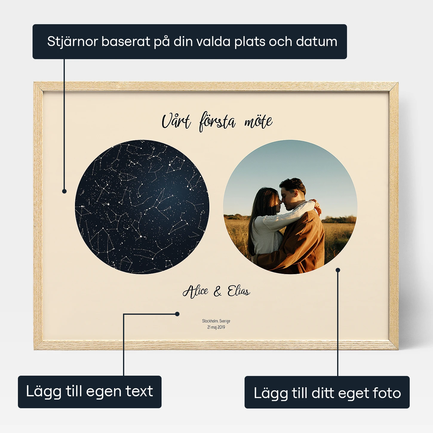 Att skapa ditt himmelska mästerverk är en barnlek med vår online-skapare. Välj helt enkelt din favoritstil, välj de himmelska elementen som konstellationer eller Vintergatan och lägg till en meningsfull titel. Ange det specifika datumet och platsen och se stjärnkartan komma till liv i förhandsgranskningen online. Förstärk den personliga prägeln genom att ladda upp ett foto.