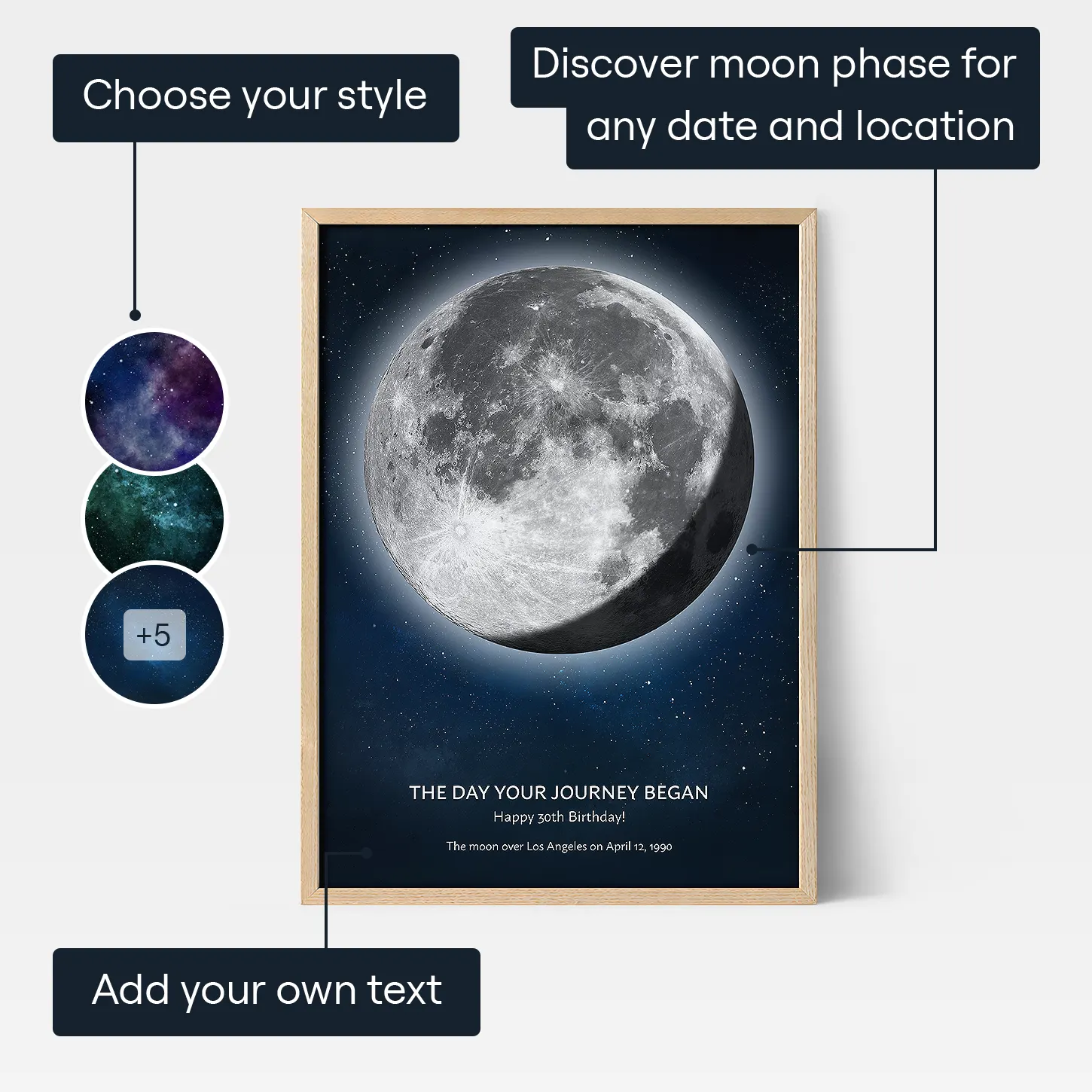 En födelsedagsmånefas ger dig minnen av en speciell natt i ditt liv. Varje måntryck är utformat efter hur månen såg ut på ett visst datum och en viss plats. Det är som att titta på samma måne från just den kvällen.