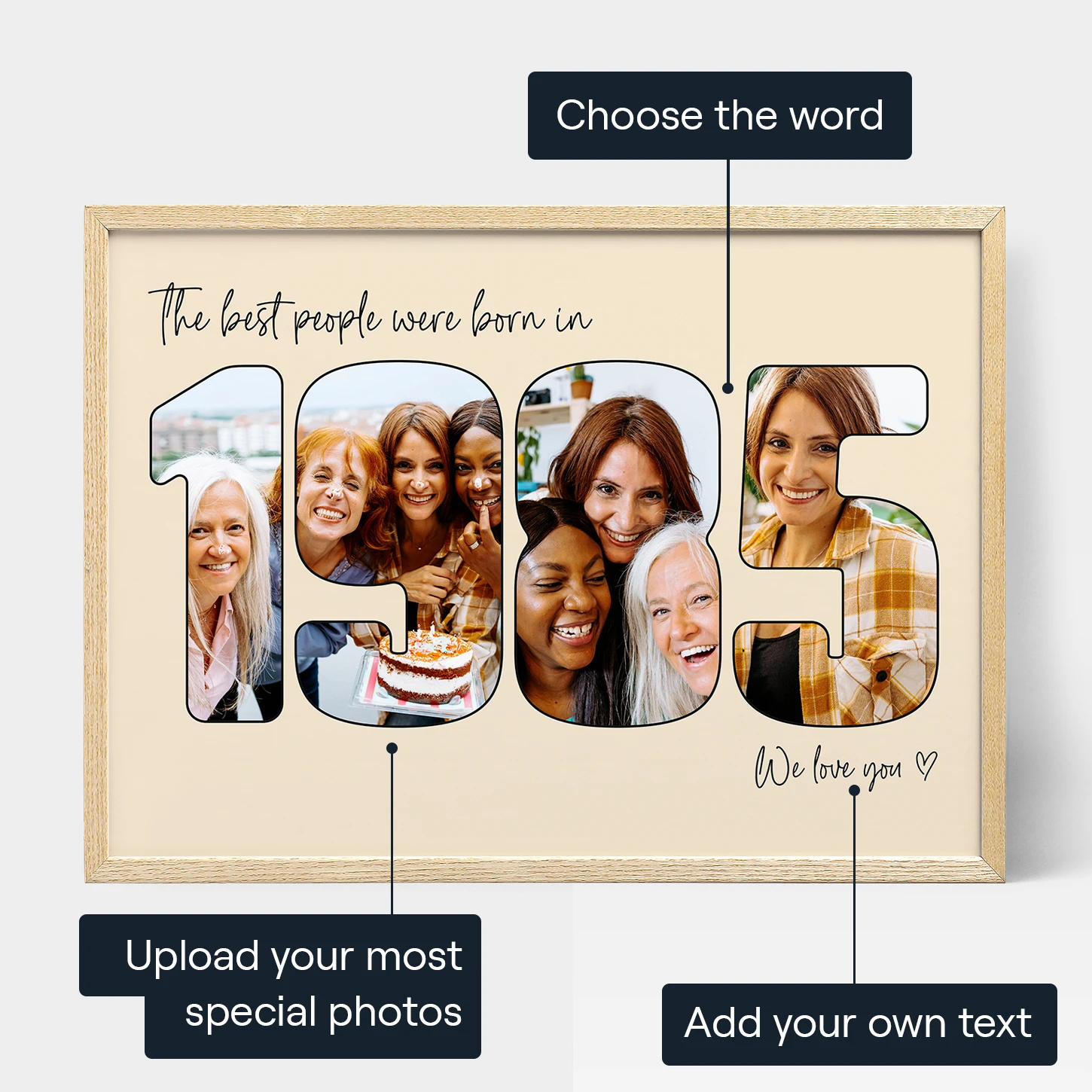 Denna extraordinära gåva skiljer sig från andra som du kan hitta på butikshyllorna. Det är inte bara en slumpmässig sak som lätt kan glömmas bort. Det är en gåva som verkligen är unik och personlig. Fotokollage med årtalsformade födelsedagsfoton firar det speciella året då någon är född och visar upp deras käraste minnen. Det är en gåva som de kommer älska i många år framöver och påminna dem om de glada stunder som de har upplevt längs vägen.