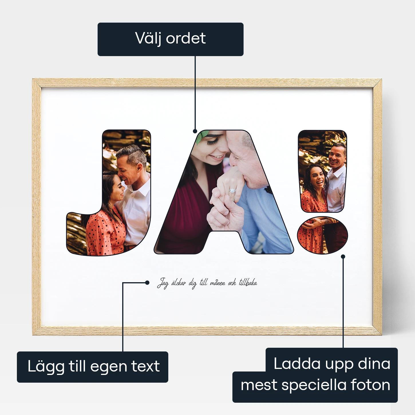 Fotocollage med förlovningsbrev är en cool present till förlovade. Det är en speciell tavla eller canvas som handlar om dig! Det är ett collage av bilder där du kan välja vilket kort ord du vill. Det kan vara ert förlovningsdatum eller ord som "ja!", "förlovad" eller "älskar dig". Det är du som bestämmer!