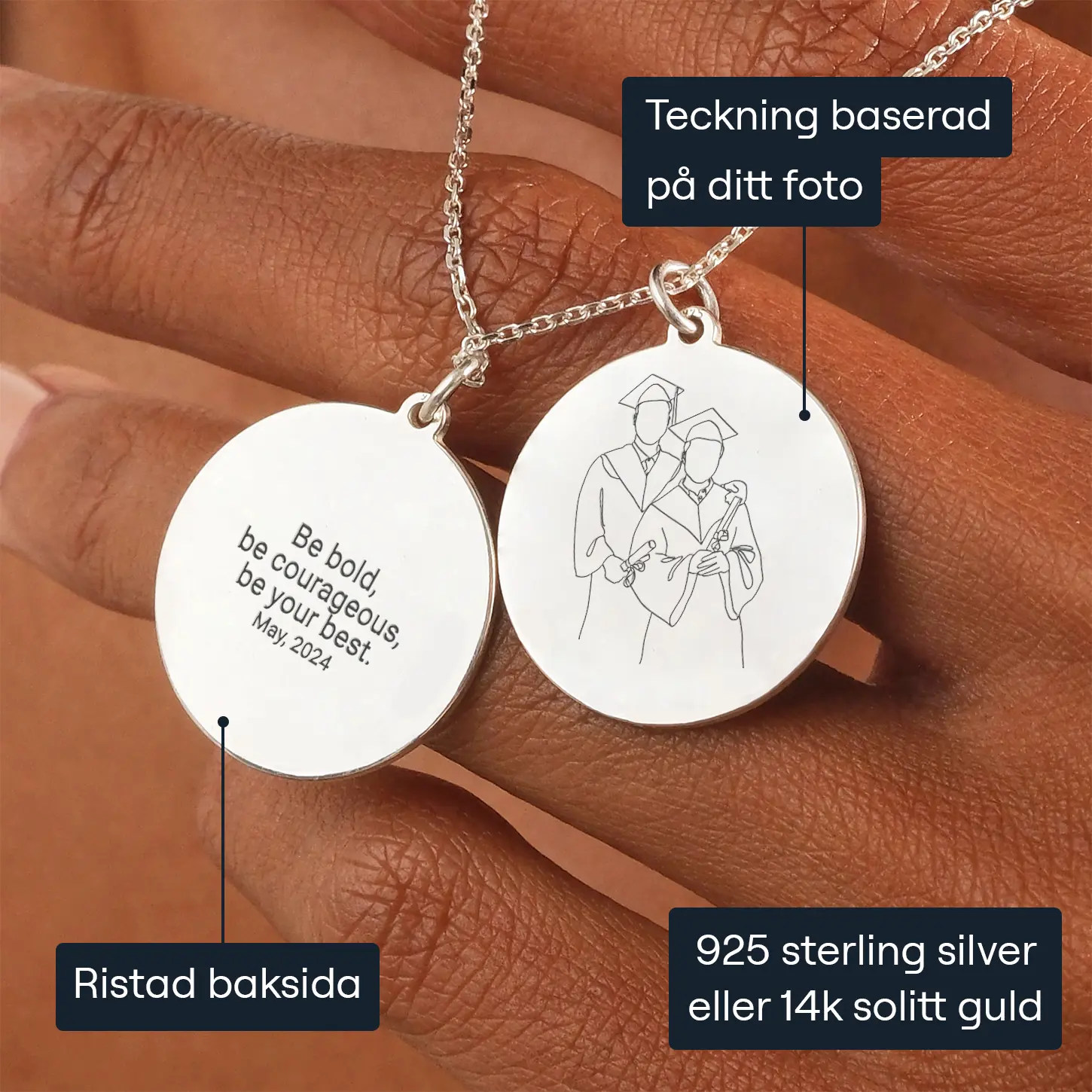 Dina personliga smycken levereras i en elegant ask tillsammans med skötselråd och en speciell rengöringsduk, vilket visar vårt engagemang för att inte bara ge dig smycken utan också en värdefull upplevelse. Ladda upp ett examensfoto för att skapa ett unikt konstverk på framsidan av hänget - en vacker påminnelse om denna viktiga milstolpe. På baksidan kan du gravera in ett personligt meddelande, vilket ger en djupt personlig touch till minnet av en resa av utbildning och utveckling.