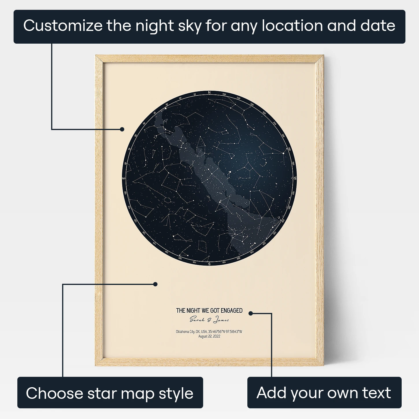 När det gäller att hitta den bästa personliga förlovningspresenten behöver du inte leta längre än till The Night We Got Engaged. Denna fantastiska stjärnkarta med tryck förevigar stjärnorna som lyste på ditt enda ögonblick i livet. Till skillnad från vanliga presenter som du hittar på butikshyllorna är denna unika skatt ett bevis på den kärlek och samhörighet som ni delar. Beställ din personliga stjärnkarta idag och låt magin från den förtrollande natten lysa upp era liv för alltid.