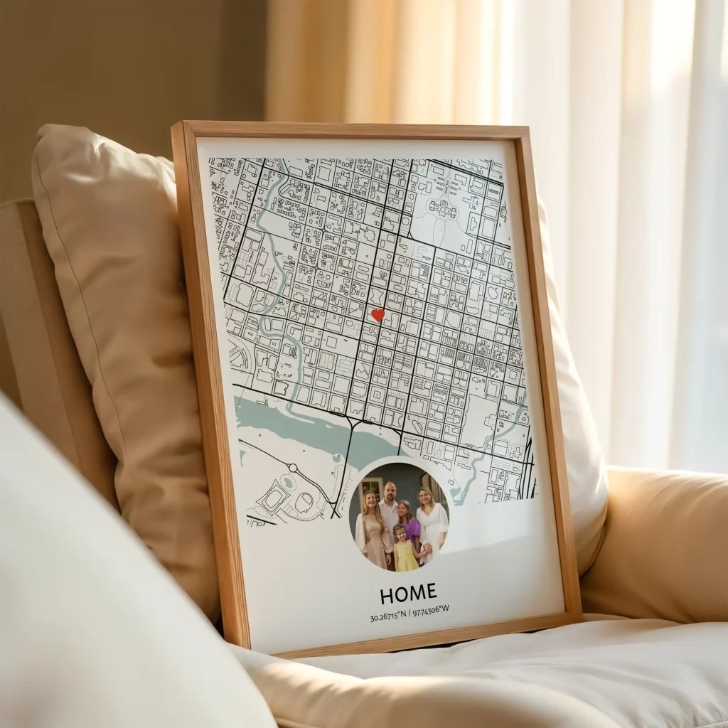 New Home Map med foto är en unik och omtänksam inflyttningspresent. Fira deras nya resa och den plats de nu kallar sitt hem med en personlig karta som fångar kärnan i deras nya grannskap.