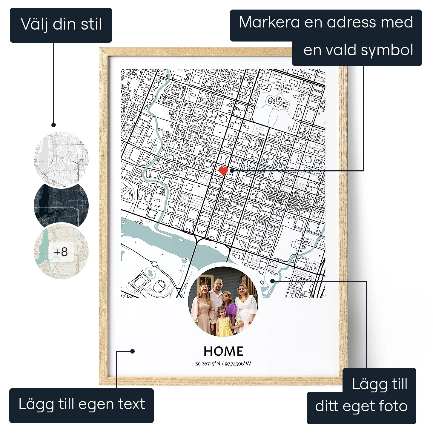 Vår online-skapare gör personalisering enkelt och roligt. Välj form och färg på kartan genom att välja bland fördefinierade färgscheman eller experimentera med egna val. Ange den nya adressen, zooma in och ut för att få en perfekt vy och lägg till en hjärtformad markör för att peka ut den exakta platsen. Ladda upp ett vackert foto och lägg till ett meningsfullt meddelande som "Nytt hem".
