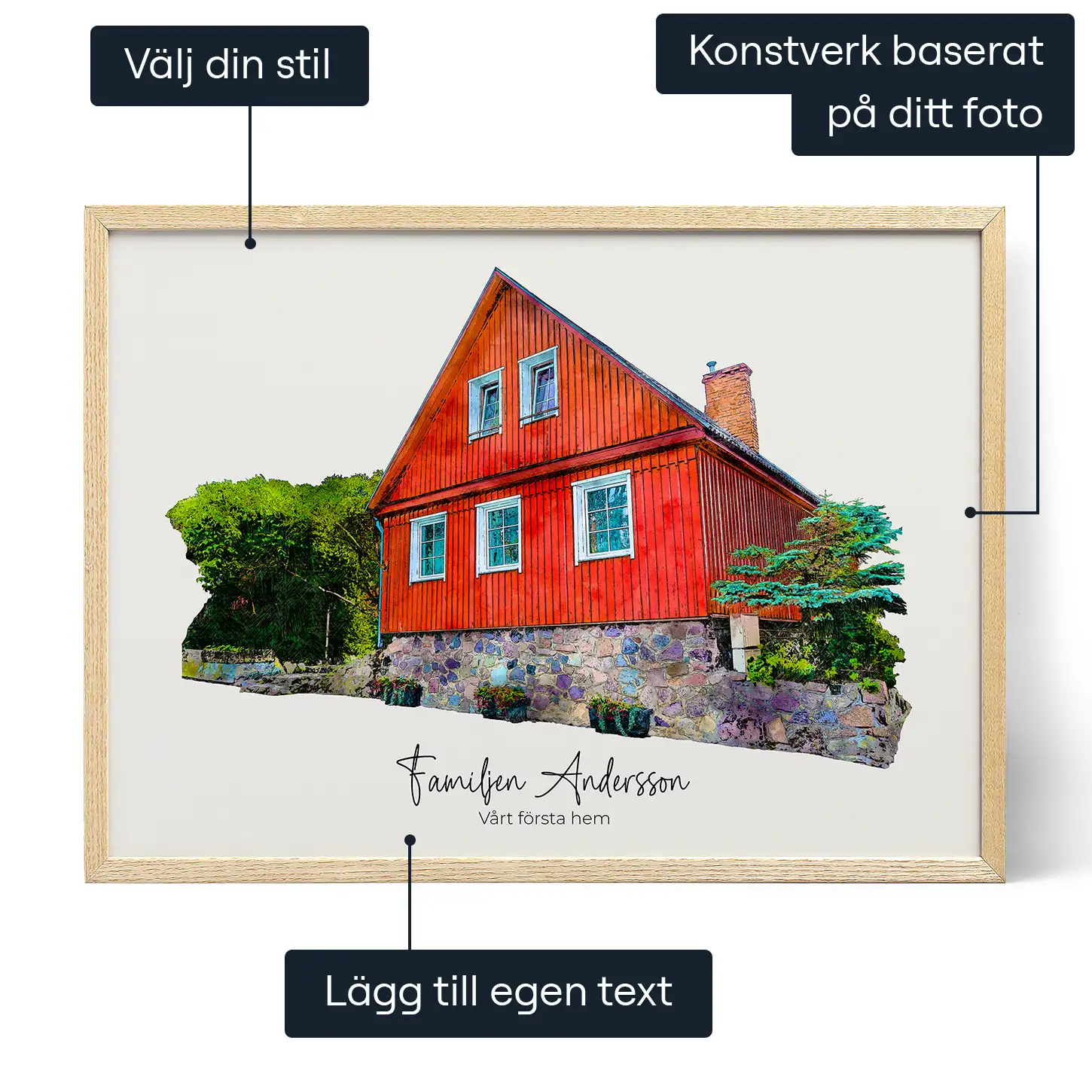 Förvandla ett foto av ert hem till ett personligt digitalt porträtt, med egen text, för den perfekta minnessaken, oavsett om det gäller ert första hem eller drömhus.
