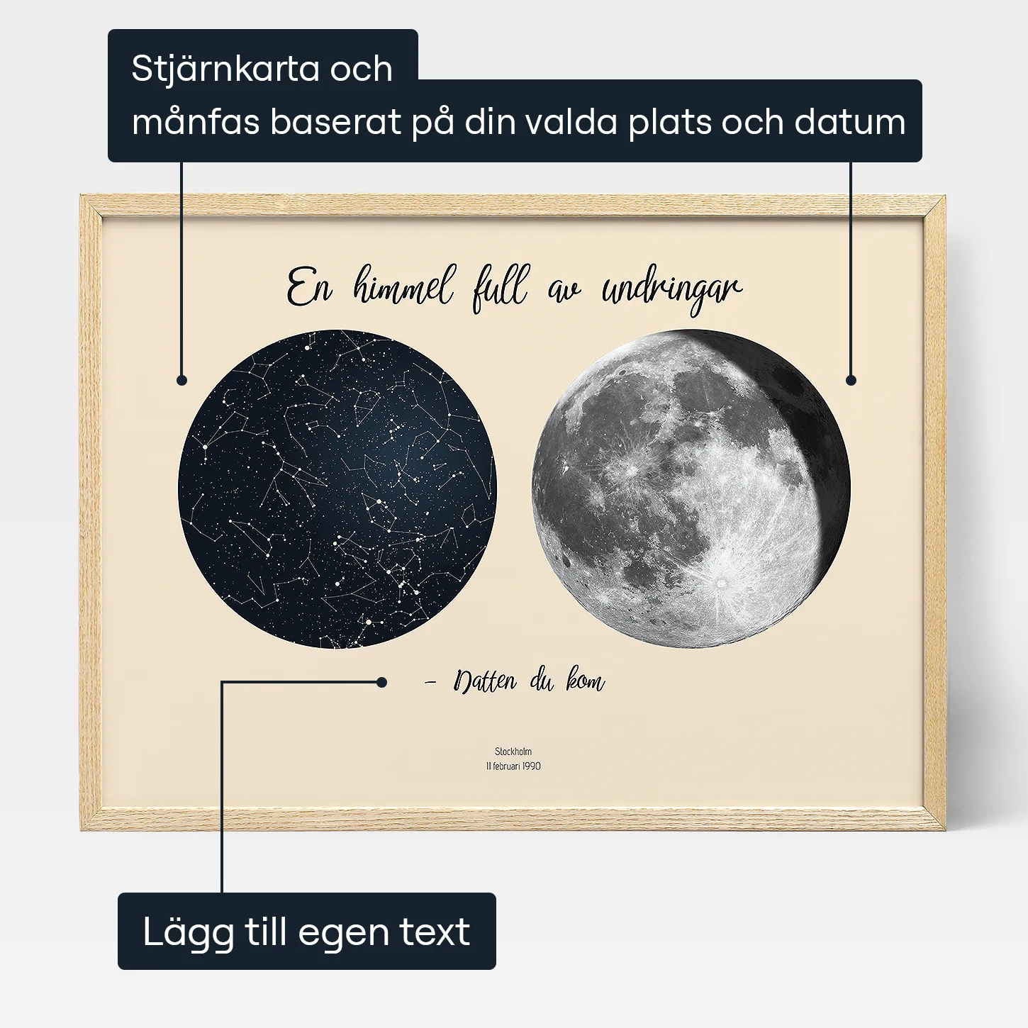 En personlig poster som fångar den exakta månfasen och den stjärnklara himlen från natten du föddes. Detta himmelska konstverk bevarar magin från den speciella stunden och blir ett tidlöst minne för dig själv eller en meningsfull gåva till någon du håller kär