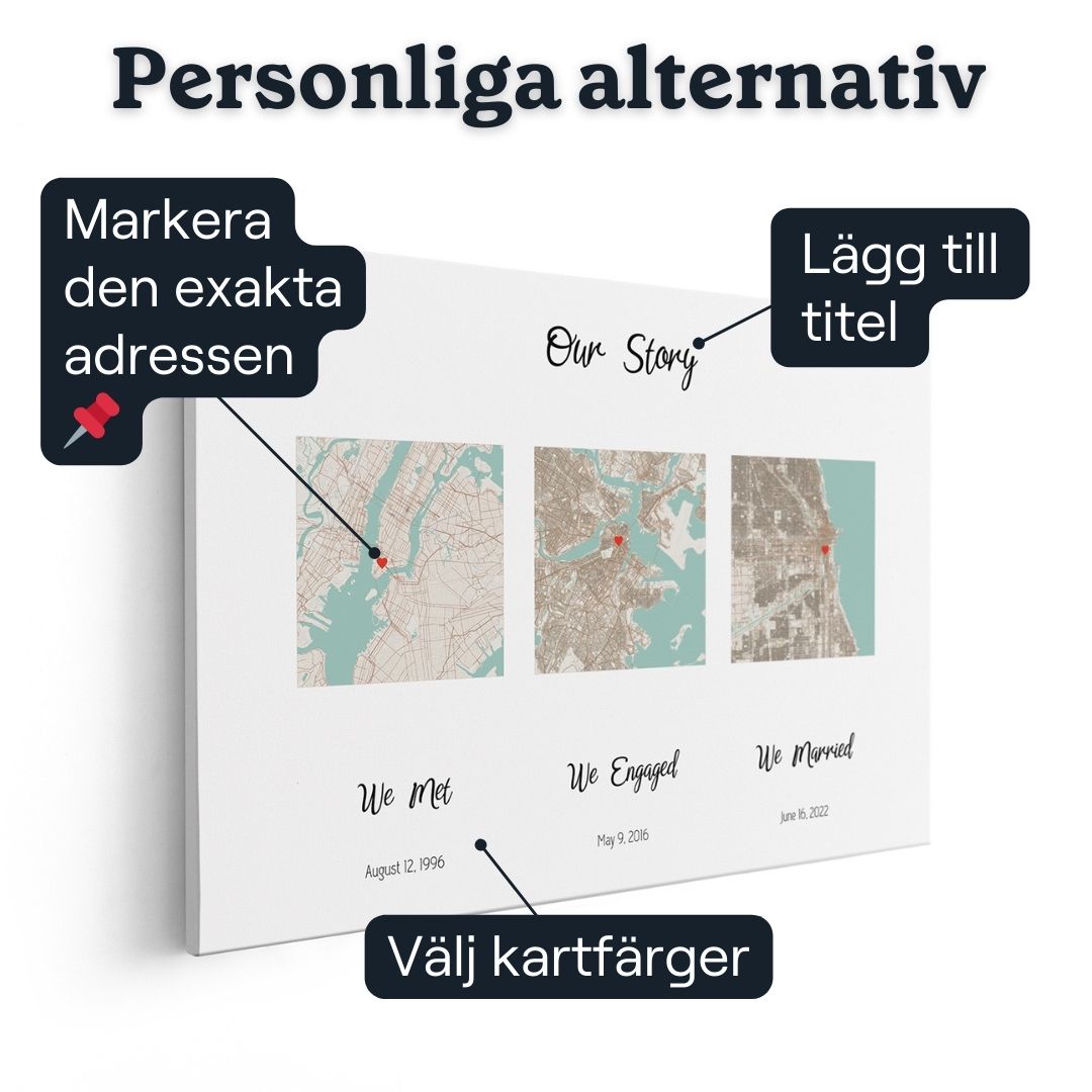 Det är enkelt att välja rätt format med våra olika canvasalternativ, så att din karta ser fantastisk ut på vilken vägg som helst. Det är enkelt att beställa - besök bara vår webbplats, ange de tre platserna, anpassa dina kartor, lägg till dina titlar och anpassade texter, välj ditt canvasformat och gör din beställning. Vi tar hand om resten och ser till att din duk tillverkas och levereras med omsorg.
