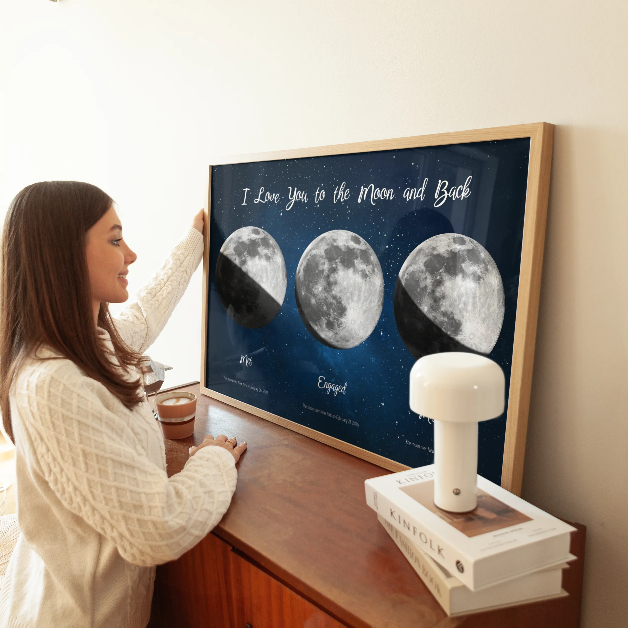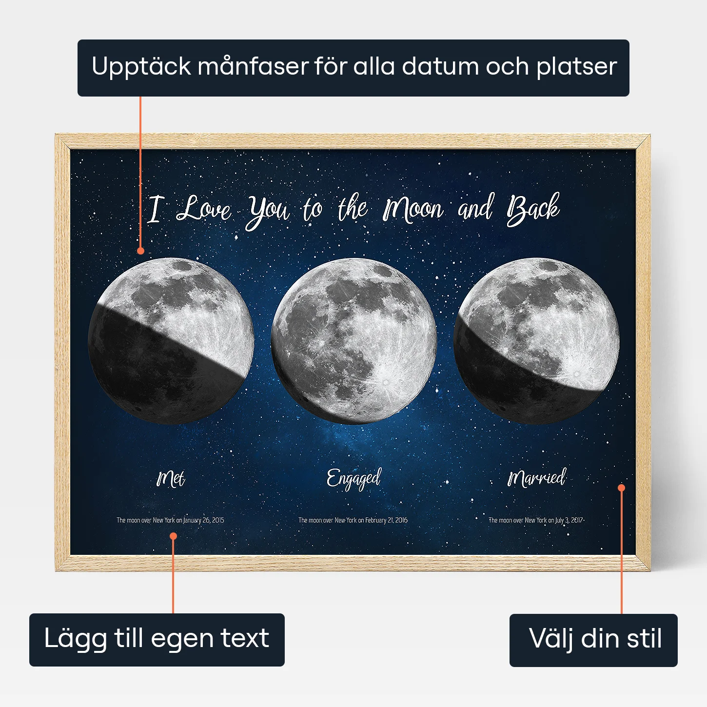 Letar du efter en unik och meningsfull gåva till din älskade? Vår Triple Moon Poster är det perfekta valet. Detta personliga tryck visar tre månfaser sida vid sida och fångar speciella ögonblick i ditt liv på ett vackert och minnesvärt sätt.