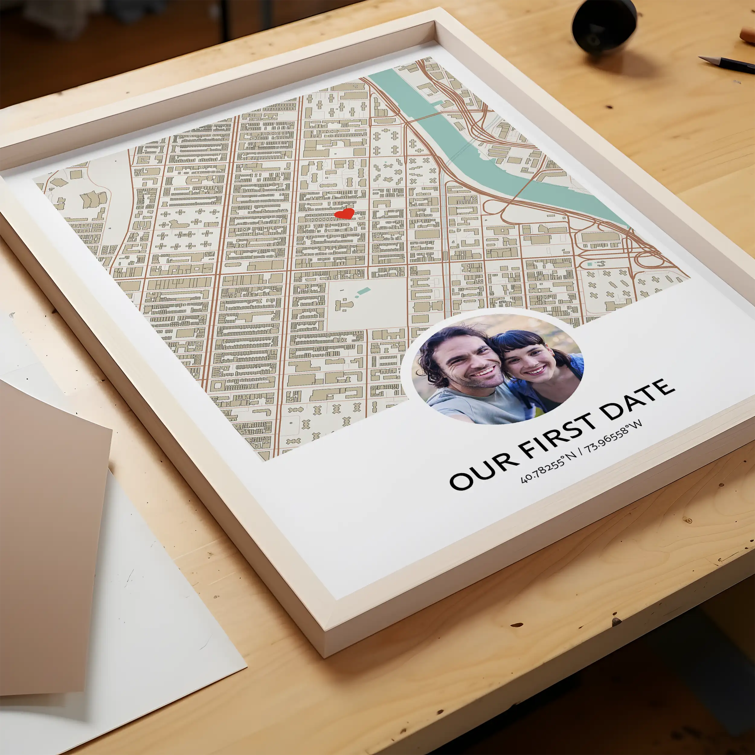 Vår första dejt - karta med foto är en unik och omtänksam present till årsdagar, födelsedagar, alla hjärtans dag, bröllop eller andra speciella tillfällen. Fira er resa tillsammans genom att ge en gåva som fångar kärnan i ert förhållande.