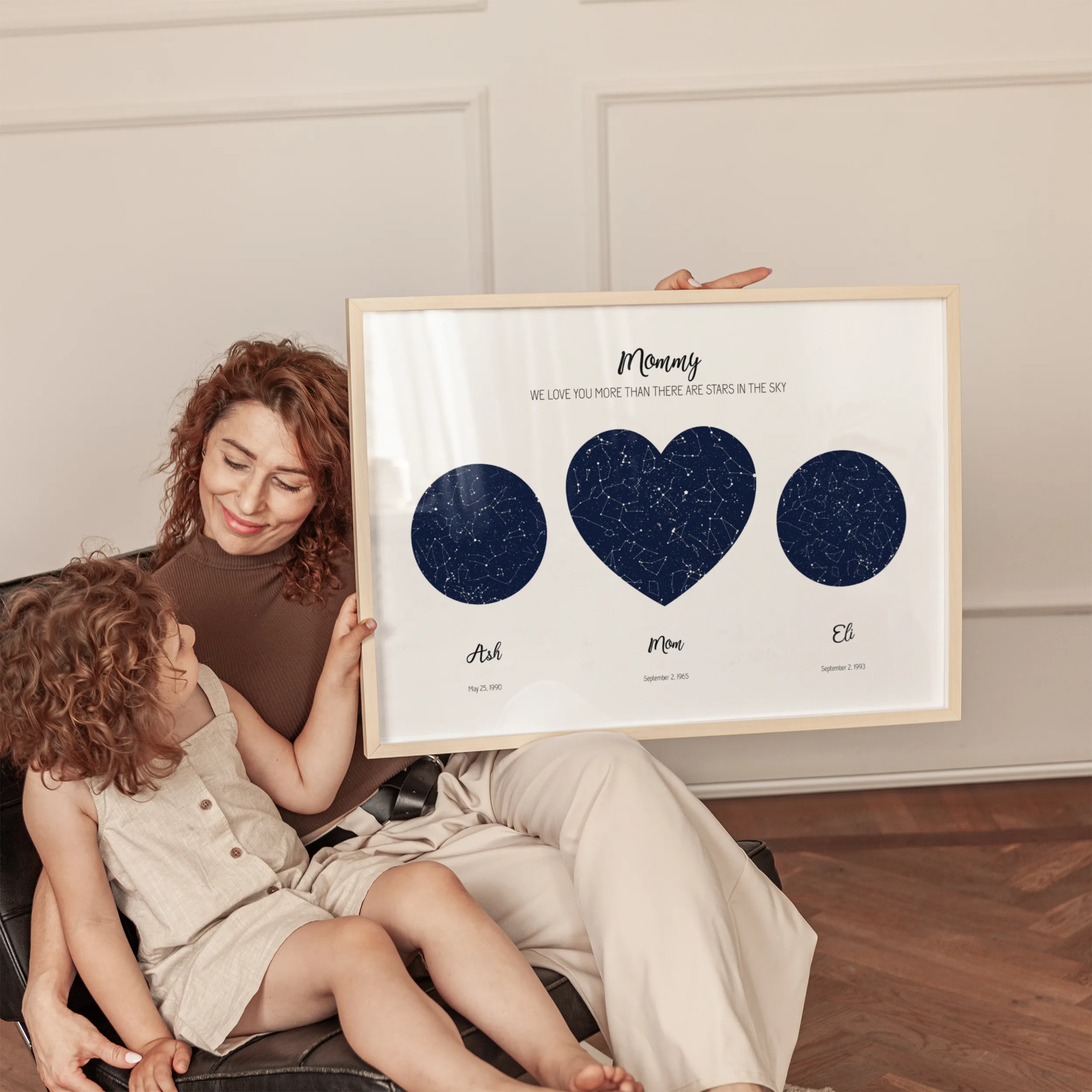 Det här trycket innehåller tre vackra stjärnkartor på en enda affisch, vilket gör det helt anpassningsbart. En av stjärnkartorna visar datum och plats för din mammas födelse, medan de andra två kartorna är tillägnade dig och dina syskon.