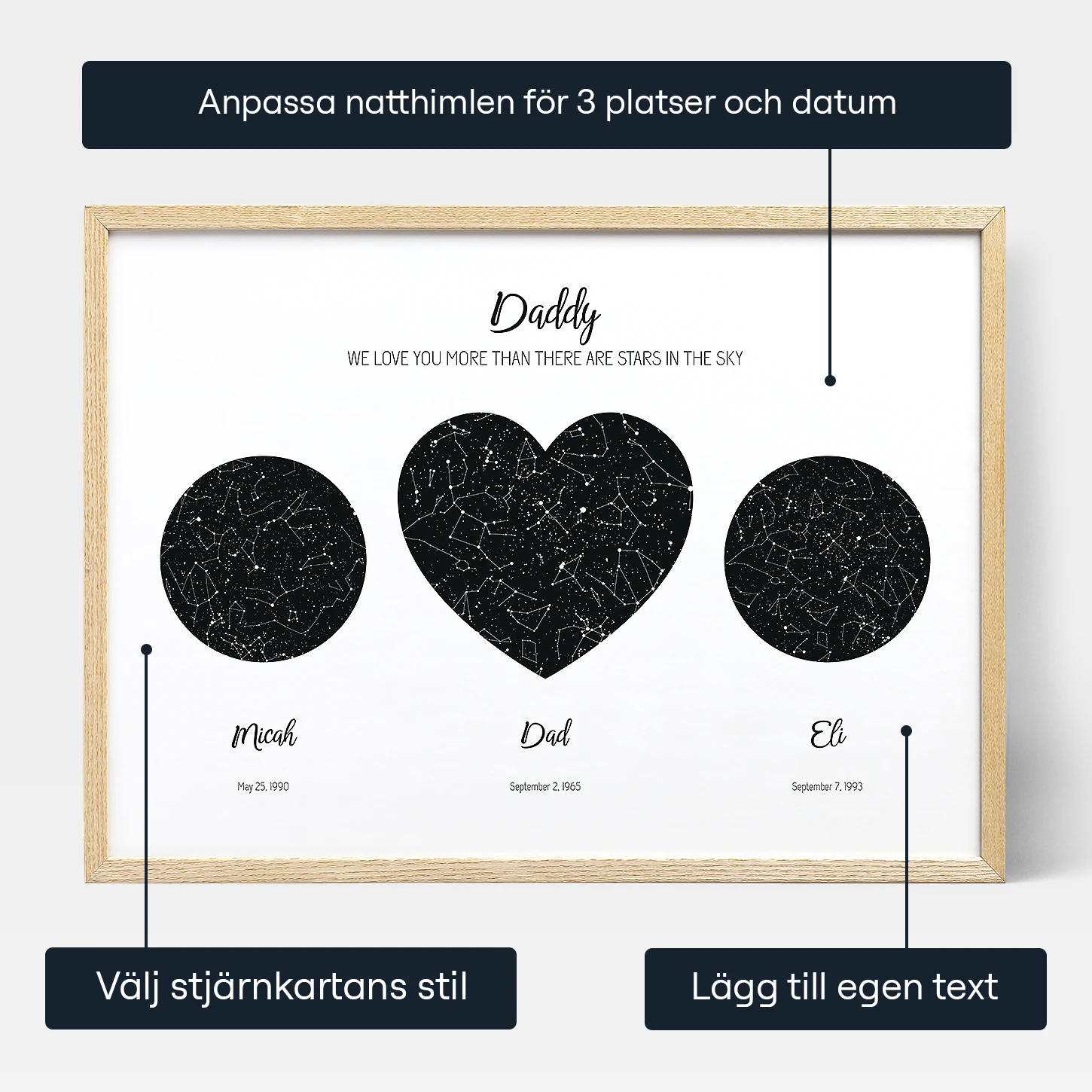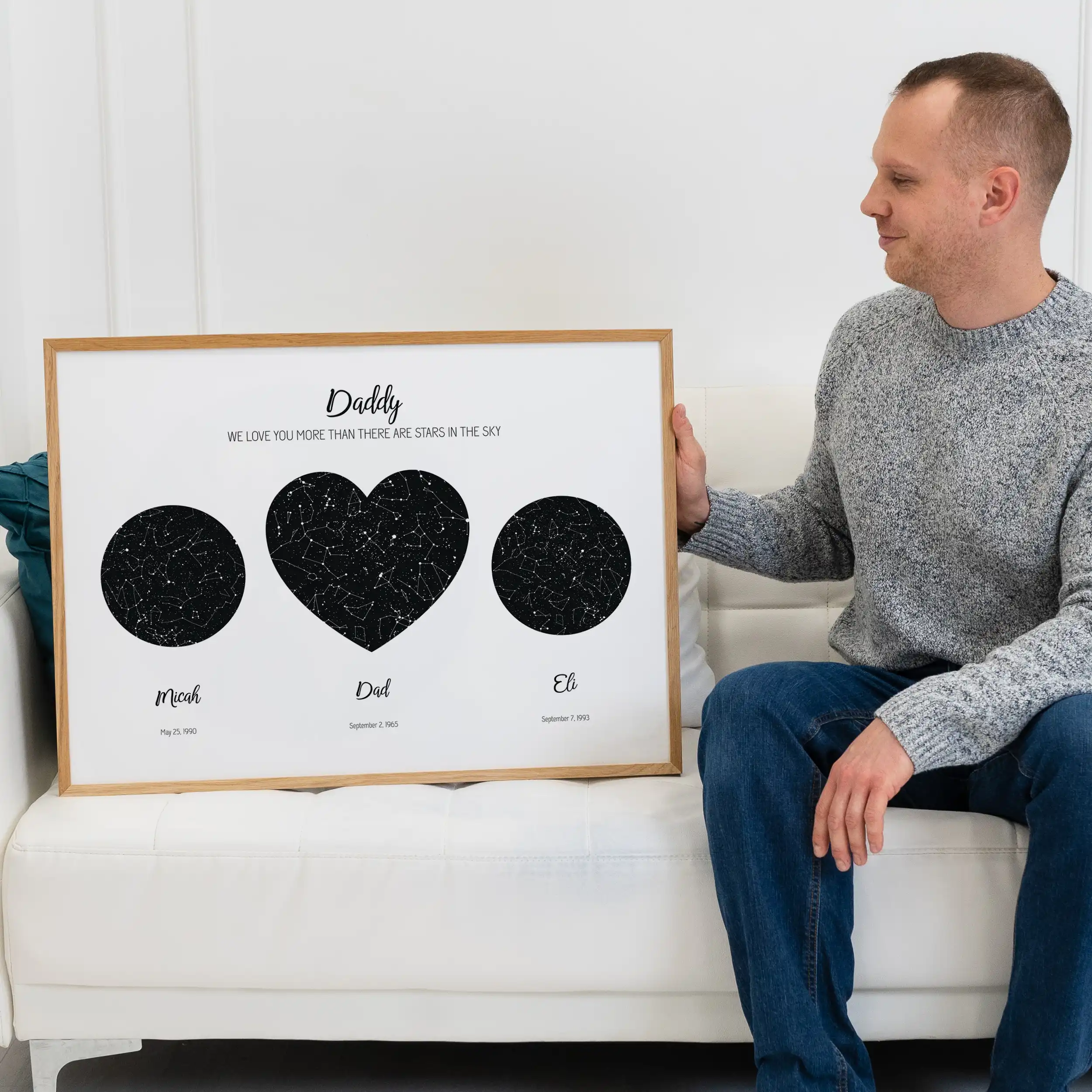 Den här presenten har tre vackra stjärnkartor på en enda affisch och är helt anpassningsbar. En av kartorna visar datum och plats för din fars födelse, medan de andra två kartorna är tillägnade dig och dina syskon.