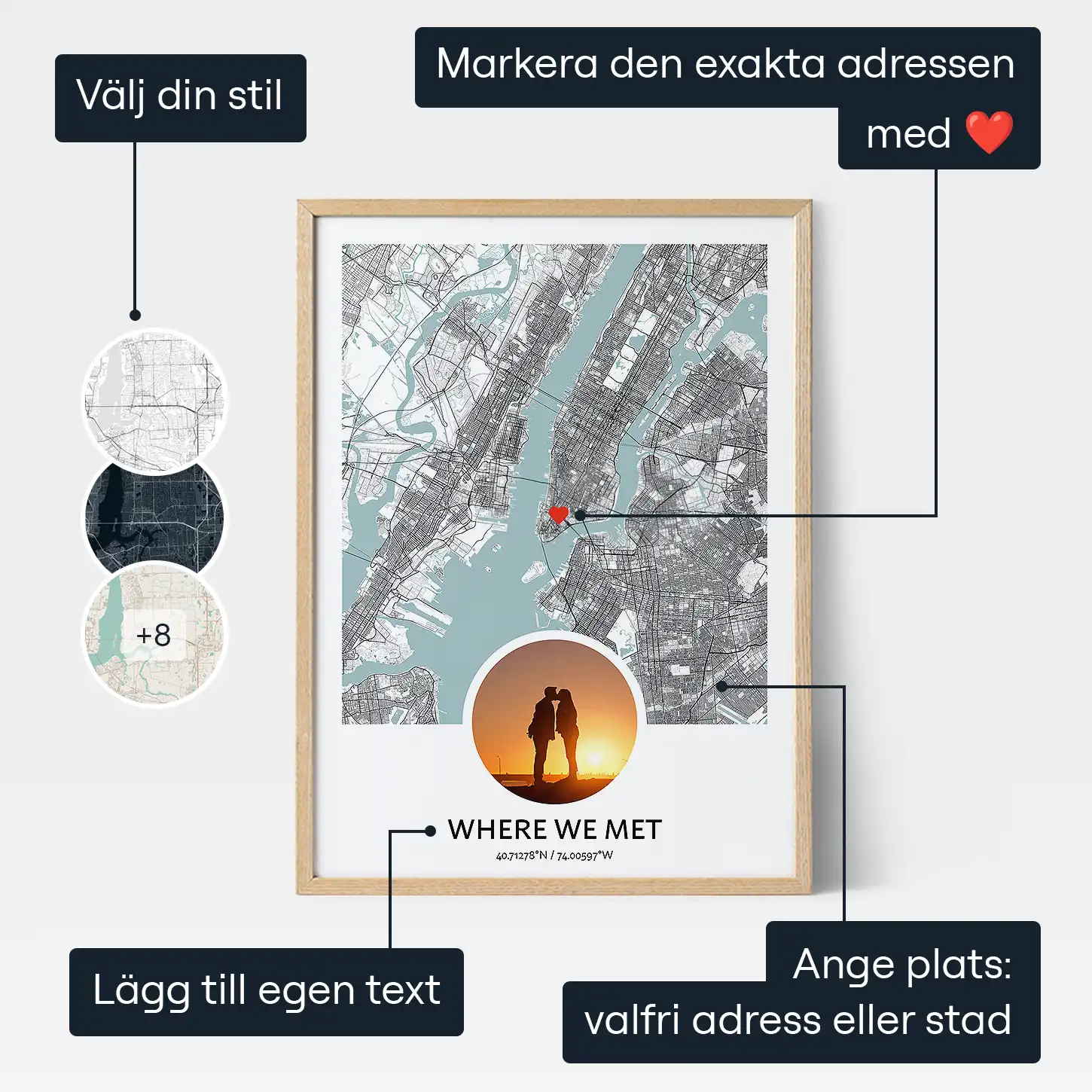 Kartan Where We Met med foto är en unik och omtänksam present till årsdagar, födelsedagar, alla hjärtans dag, bröllop eller andra speciella tillfällen. Fira er resa tillsammans genom att ge en gåva som fångar hjärtat i er relation.